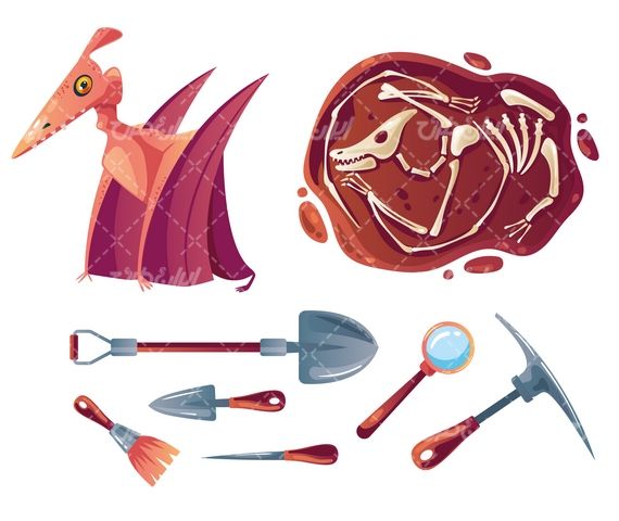 وکتور باستان شناسی , بیل , ذره بین , بیل , ابزارآلات باستان شناسی , دایناسور ,