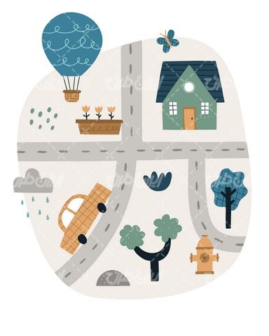 وکتور برداری ساختمان کارتونی به همراه خودرو و بالون