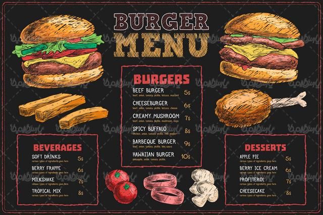 در این فایل Illustrator ،منوی فست فود و اغذیه نیز وجود دارد که قابل استفاده در طرح کارت ویزیت ، طرح بنر و دیگر طرح های گرافیکی و تبلیغاتی