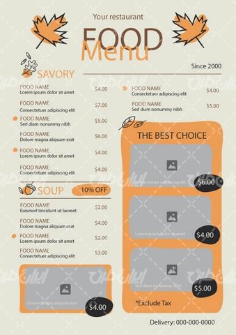 در این فایل Illustrator ،منو و منوی رستوران نیز وجود دارد که قابل استفاده در طرح کارت ویزیت ، طرح بنر و دیگر طرح های گرافیکی و تبلیغاتی می باشد