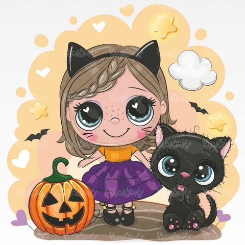 وکتور شب وحشت , دختربچه , وکتور کارتون , Halloween vector , برنامه کودک , گربه , وکتور کدو , کارتون , وکتور هالوین ,